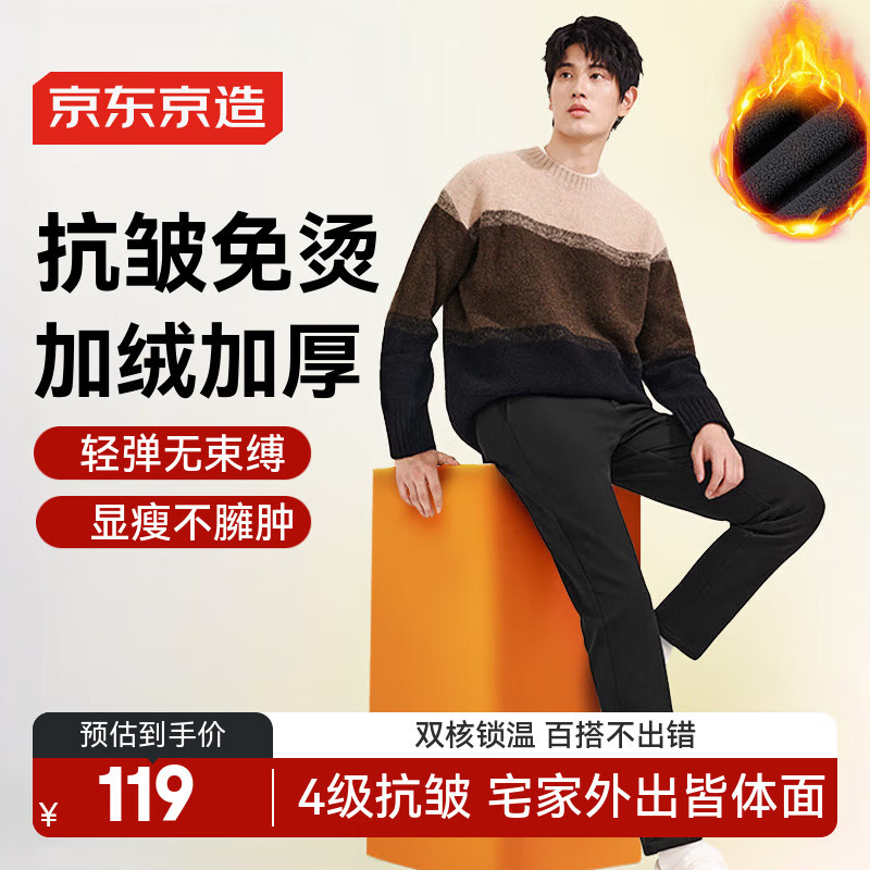 包邮 京东京造【加绒加厚】休闲裤男西裤子男士服装秋冬易打理西装裤 黑色2XL